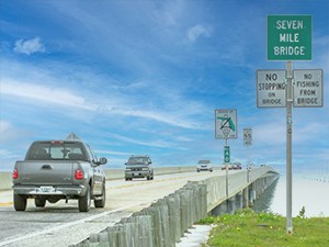 The longest island-hopping span in the Keys is the modern Seven Mile Bridge. Completed in 1982, it runs parallel to the former highway and old railway structure. Visitors interested in Keys history can walk or take a tram along the old rail bed to tiny Pigeon Key.