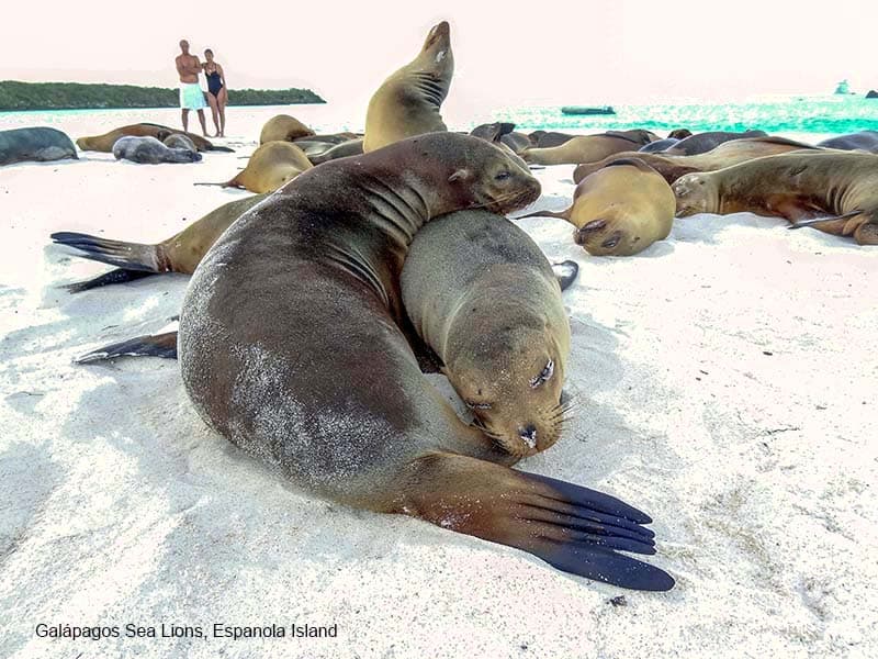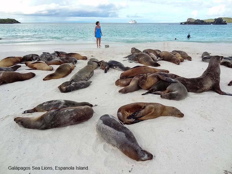 These islands are home to Marine iguanas (the only sea lizards in the world and which look like little dragons), birds with blue or red feet, albatrosses with seven-foot wingspans, gigantic 100+-year-old tortoises weighing more than 500 pounds, and many other species you’ll find nowhere else. Best of all, because of their remoteness, Galapagos animals and birds aren’t afraid of humans so you can get quite close to them, as you’ll see in the photos below.